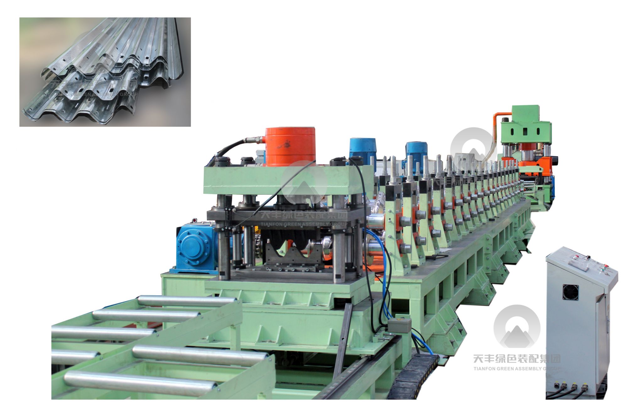 TF高速公路護欄板冷彎生產線,可以實現原單張多工序、不間斷生產,集開卷、矯平、沖孔、成型、剪切于一體的連續(xù)式生產,使產品外型標準,沖孔一致安裝便易。生產線生產速度高,在線沖孔連續(xù)成型生產,操作方便,使用人工少。